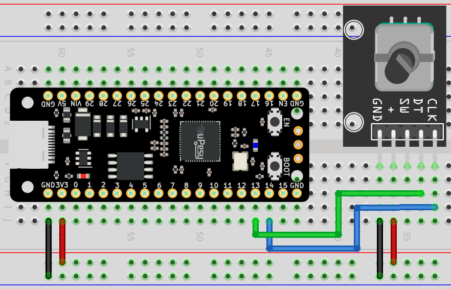 Je vous recommande d’alimenter l’encodeur en 3.3V afin d’avoir des niveaux logiques conformes aux spécifications du Pi Pico.