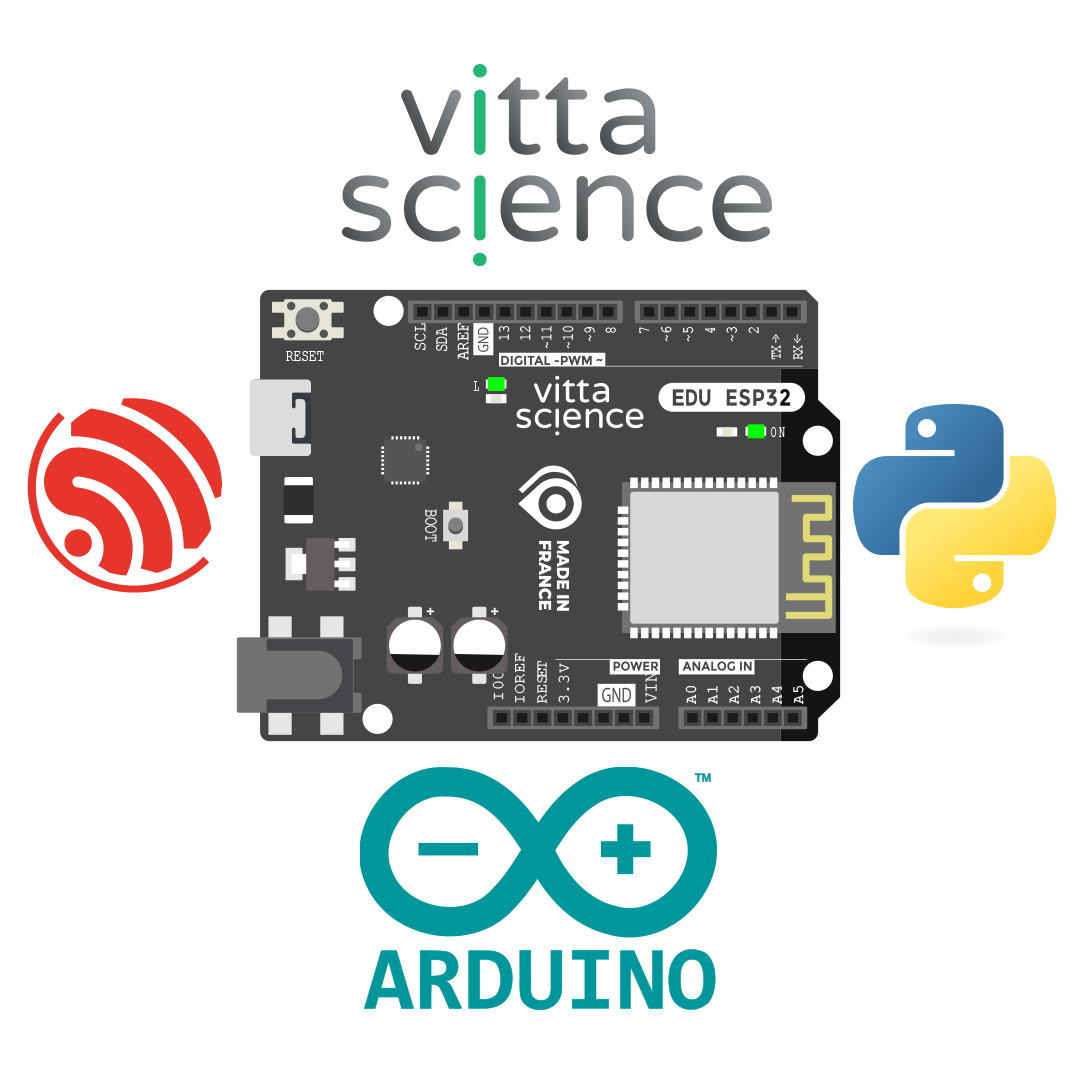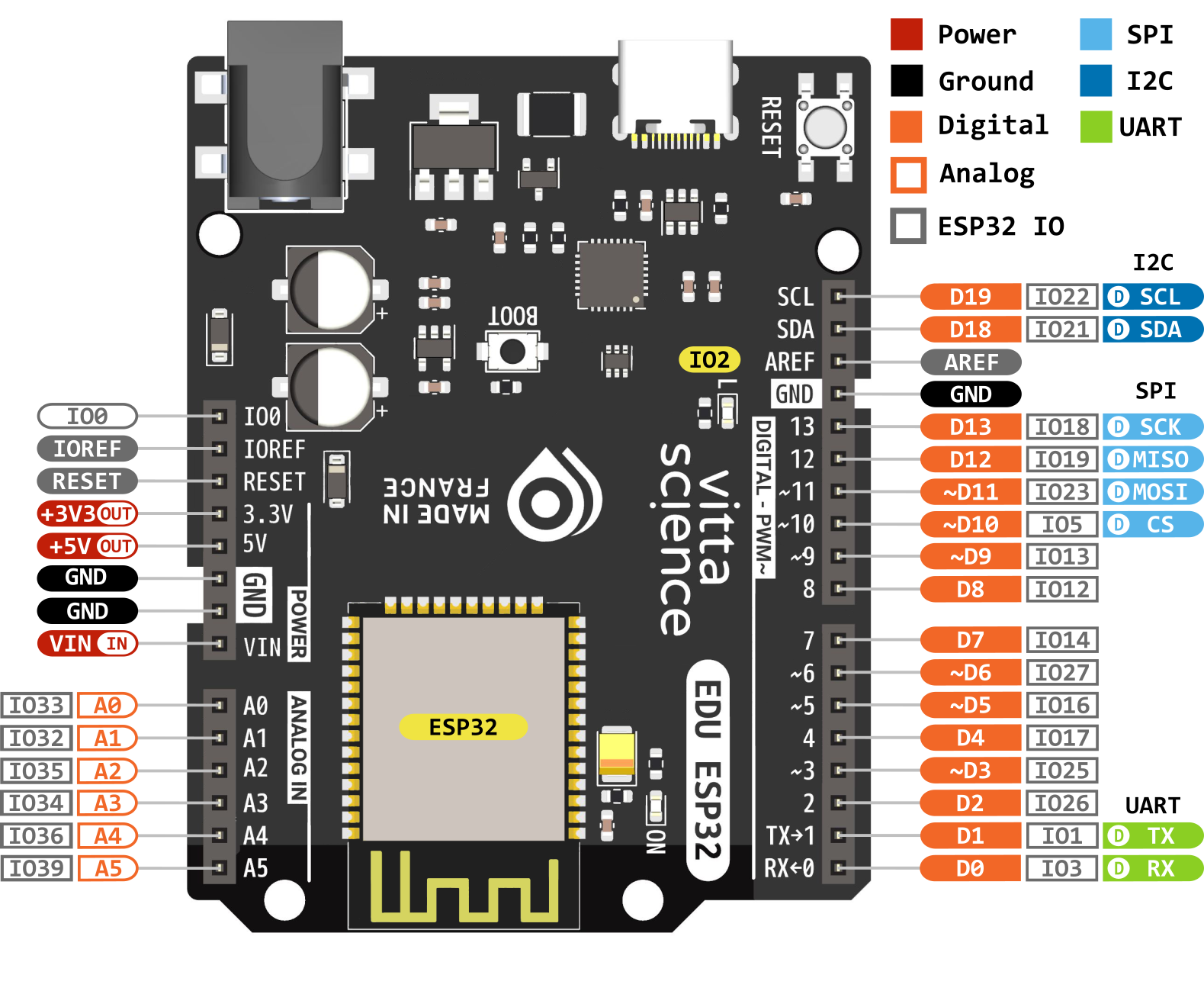 L'EDU ESP32 est née d'une collaboration avec Vittascience (une plateforme éducative pensée pour l'apprentissage du codage, qui propose des outils innovants pour l'enseignement), pour proposer une carte au format UNO Made In France avec le WiFi/Bluetooth d'inclus.