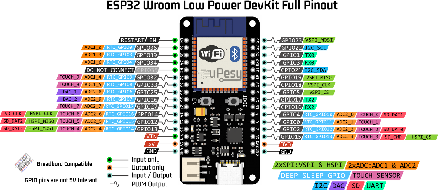 - 📌 Pratique : Compatible avec la carte uPesy Wroom Devkit : même taille, même broches (seule la broche GPIO35 ne sera pas utilisable car elle permet d'estimer la charge de la batterie). Elle hérite donc de tous ses avantages pratiques : compatible breadboard, téléversement automatique, connecteur USB C, …